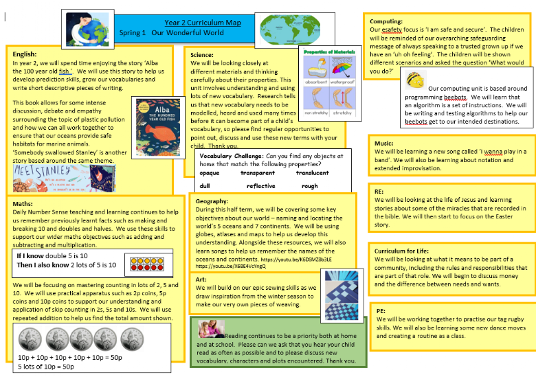 Here you can find out more about what children will be learning, experiencing and enjoying at school in each subject. Curriculum Letters are sent to parents each half-term through parent mail also.